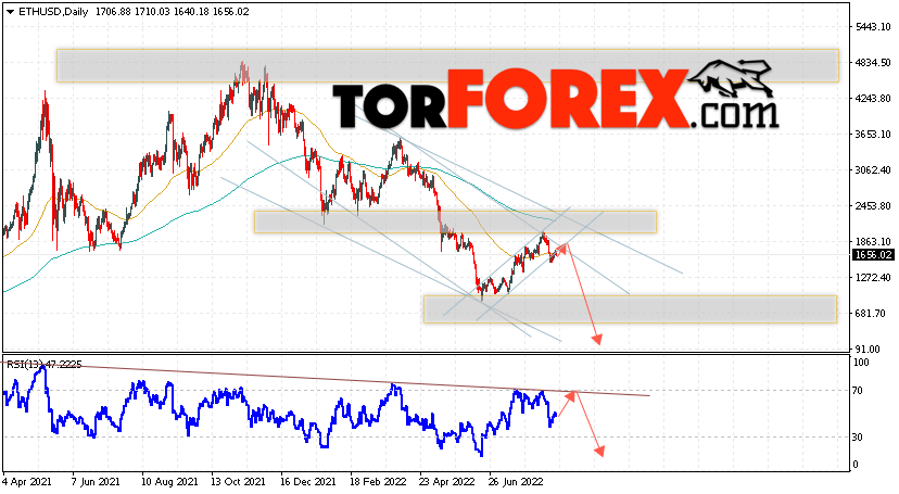 Дополнительным сигналом в пользу падения котировок ETH/USD на текущей торговой неделе 29 августа — 2 сентября 2022 выступит тест сопротивления тренда на индикаторе относительной силы. Вторым сигналом станет отскок от верхней границы медвежьего канала. Отменой варианта падения стоимости криптовалюты на текущей торговой неделе станет сильный рост и пробой уровня 2565. Это укажет на пробой области сопротивления и продолжение подъёма котировок ETH/USD с потенциальной целью выше уровня 2995. Подтверждением падению криптовалюты Ethereum выступит пробой области поддержки и закрытие котировок ниже уровня 1295, что укажет на пробой нижней границы бычьего канала коррекции.