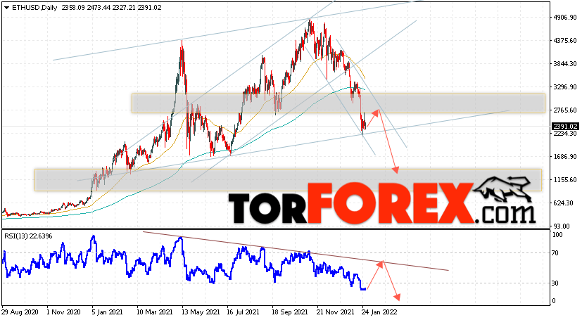Дополнительным сигналом в пользу падения котировок ETH/USD на текущей торговой неделе 31 января — 4 февраля 2022 выступит тест нисходящей линии тренда на индикаторе относительной силы. Вторым сигналом станет отскок от верхней границы нисходящего канала. Отменой варианта падения стоимости криптовалюты на текущей торговой неделе станет сильный рост и пробой уровня 3305. Это укажет на пробой области сопротивления и продолжение подъёма котировок ETH/USD с потенциальной целью выше уровня 4855. Подтверждением падению криптовалюты Ethereum выступит пробой области поддержки и закрытие котировок ниже уровня 2165, это сильная поддержка для покупателей актива, а также на пробой нижней границы бычьего канала.
