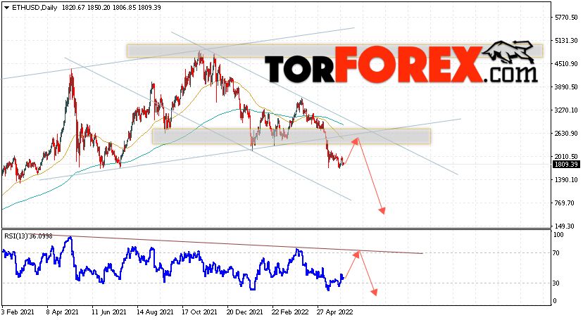 Дополнительным сигналом в пользу падения котировок ETH/USD на текущей торговой неделе 6 — 10 июня 2022 выступит тест сопротивления тренда на индикаторе относительной силы. Вторым сигналом станет отскок от нижней границы бычьего канала. Отменой варианта падения стоимости криптовалюты на текущей торговой неделе станет сильный рост и пробой уровня 2835. Это укажет на пробой области сопротивления и продолжение подъёма котировок ETH/USD с потенциальной целью выше уровня 3535. Подтверждением падению криптовалюты Ethereum выступит пробой области поддержки и закрытие котировок ниже уровня 1455.