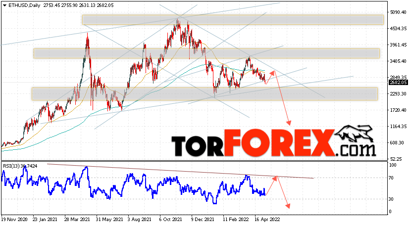 Дополнительным сигналом в пользу снижения котировок ETH/USD на текущей торговой неделе 9 — 13 мая 2022 выступит тест нисходящей линии тренда на индикаторе относительной силы. Вторым сигналом станет отскок от верхней границы нисходящего канала. Отменой варианта падения стоимости криптовалюты на текущей торговой неделе станет сильный рост и пробой уровня 3505. Это укажет на пробой области сопротивления и продолжение подъёма котировок ETH/USD с потенциальной целью выше уровня 4255. Подтверждением падению криптовалюты Ethereum выступит пробой области поддержки и закрытие котировок ниже уровня 2205, что укажет на пробой нижней границы бычьего канала.