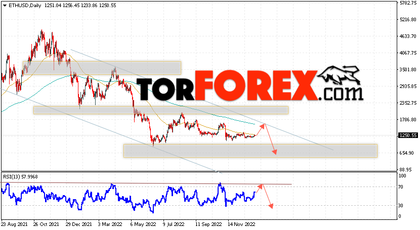 Дополнительным сигналом в пользу падения котировок ETH/USD на текущей торговой неделе 9 — 13 января 2023 выступит тест сопротивления тренда на индикаторе относительной силы. Вторым сигналом станет отскок от верхней границы нисходящего канала. Отменой варианта падения стоимости криптовалюты на текущей торговой неделе станет сильный рост и пробой уровня 1965. Это укажет на пробой области сопротивления и продолжение подъёма котировок ETH/USD с потенциальной целью выше уровня 2455. Подтверждением падению криптовалюты Ethereum выступит пробой области поддержки и закрытие котировок ниже уровня 975.
