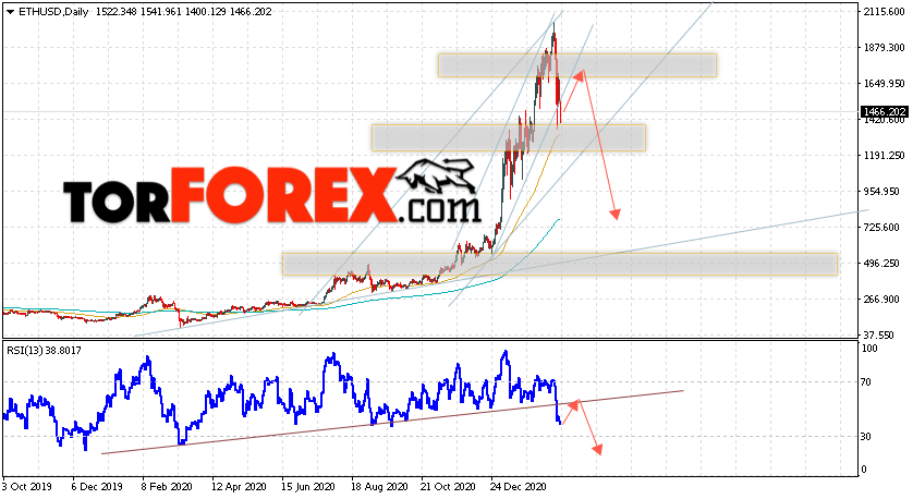 Дополнительным сигналом в пользу падения котировок ETH/USD на текущей торговой недели 1 — 5 марта 2021 выступит тест пробитой линии тренда на индикаторе относительной силы. Вторым сигналом станет отскок от нижней границы восходящей канала. Отменой варианта падения стоимости криптовалюты на текущей торговой неделе станет сильный рост и пробой уровня 1925.05. Это укажет на пробой области сопротивления и продолжение роста котировок ETH/USD с потенциальной целью выше уровня 2235.00. Подтверждением роста криптовалюты Ethereum выступит пробой области сопротивления и закрытие котировок выше уровня 2025.05.