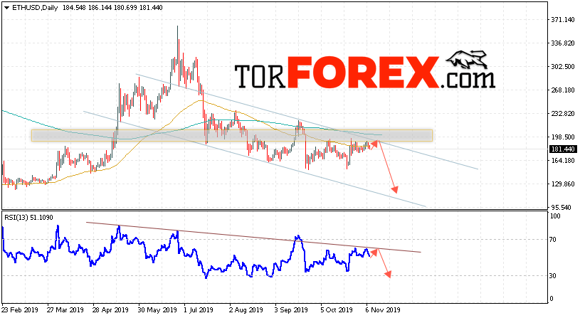 Дополнительным сигналом в пользу снижения котировок ETH/USD на текущей торговой недели 11 — 15 ноября 2019 выступит тест нисходящей линии сопротивления на индикаторе относительной силы. Вторым сигналом станет отскок от верхней границы нисходящего канала. Отменой варианта падения станет сильный рост и пробой уровня 215.50. Это укажет на пробой области сопротивления и продолжение роста ETH/USD с потенциальной целью выше уровня 255.05. Подтверждением падения криптовалюты Ethereum выступит пробой области поддержки и закрытие котировок ниже уровня 145.05.