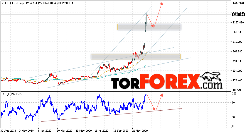 Дополнительным сигналом в пользу подъёма котировок ETH/USD на текущей торговой недели 11 — 15 января 2021 выступит тест линии поддержки на индикаторе относительной силы. Вторым сигналом станет отскок от нижней границы восходящей канала. Отменой варианта роста стоимости криптовалюты на текущей торговой неделе станет падение и пробой уровня 785.05. Это укажет на пробой области поддержки и продолжение падения котировок ETH/USD с потенциальной целью ниже уровня 475.05. Подтверждением роста криптовалюты Ethereum выступит пробой области сопротивления и закрытие котировок выше уровня 1405.05.
