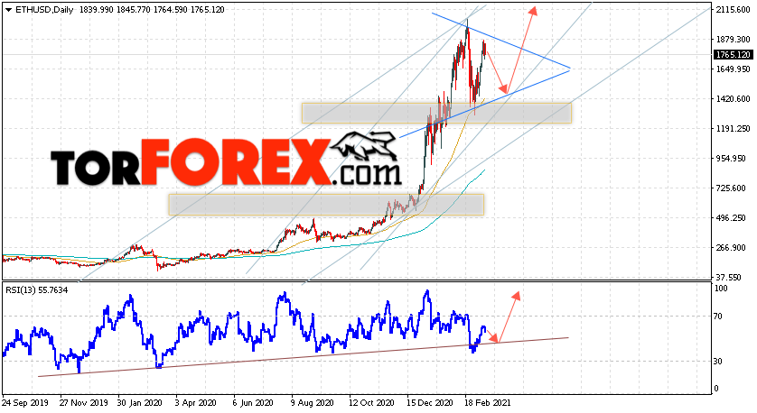 Дополнительным сигналом в пользу роста котировок ETH/USD на текущей торговой недели 15 — 19 марта 2021 выступит тест линии тренда на индикаторе относительной силы. Вторым сигналом станет отскок от нижней границы модели ”Треугольник”. Отменой варианта роста стоимости криптовалюты на текущей торговой неделе станет падение и пробой уровня 1205.05. Это укажет на пробой области поддержки и продолжение падения котировок ETH/USD с потенциальной целью ниже уровня 835.05. Подтверждением роста криптовалюты Ethereum выступит пробой области сопротивления и закрытие котировок выше уровня 1945.05, что укажет на пробой верхней границы модели ”Треугольник”.