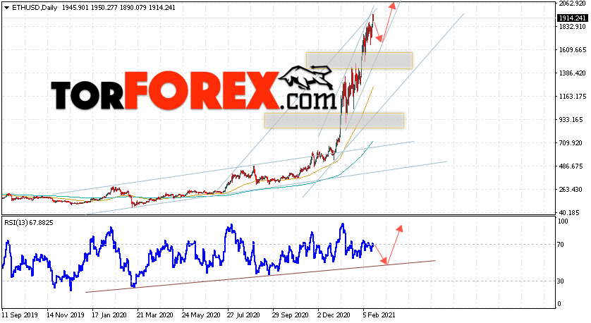 Дополнительным сигналом в пользу подъёма котировок ETH/USD на текущей торговой недели 22 — 26 февраля 2021 выступит тест линии поддержки на индикаторе относительной силы. Вторым сигналом станет отскок от нижней границы восходящей канала. Отменой варианта роста стоимости криптовалюты на текущей торговой неделе станет падение и пробой уровня 1345.00. Это укажет на пробой области поддержки и продолжение падения котировок ETH/USD с потенциальной целью ниже уровня 925.05. Подтверждением роста криптовалюты Ethereum выступит пробой области сопротивления и закрытие котировок выше уровня 2025.05.