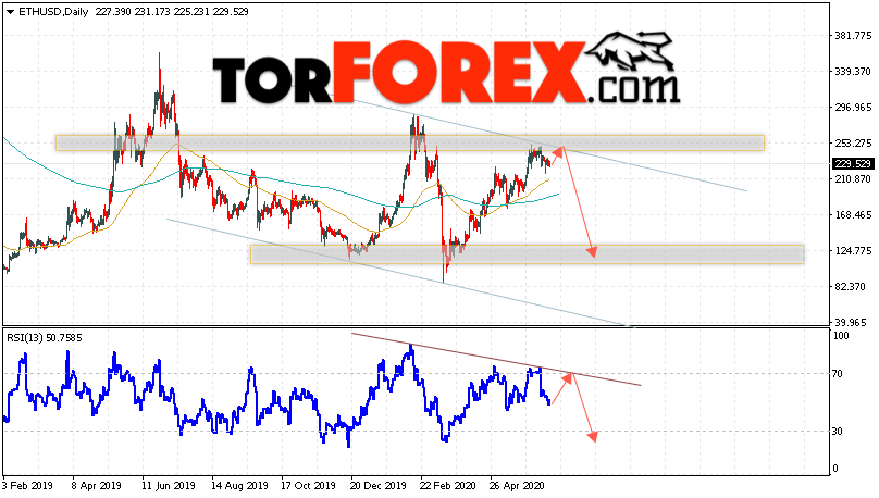 Дополнительным сигналом в пользу снижения котировок ETH/USD на текущей торговой недели 22 — 26 июня 2020 выступит тест линии сопротивления на индикаторе относительной силы. Вторым сигналом станет отскок от верхней границы нисходящего канала. Отменой варианта падения стоимости криптовалюты на текущей торговой неделе станет сильный рост и пробой уровня 265.05. Это укажет на пробой области сопротивления и продолжение роста котировок ETH/USD с потенциальной целью выше уровня 345.00. Подтверждением падения криптовалюты Ethereum выступит пробой области поддержки и закрытие котировок ниже уровня 195.55.