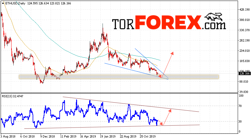 Дополнительным сигналом в пользу подъёма котировок ETH/USD на текущей торговой недели 23 — 27 декабря 2019 выступит тест восходящей линии поддержки на индикаторе относительной силы. Вторым сигналом станет отскок от нижней границы нисходящего канала. Отменой варианта роста станет падение и пробой уровня 80.05. Это укажет на пробой области поддержки и продолжение падения ETH/USD с потенциальной целью ниже уровня 55.05. Подтверждением роста криптовалюты Ethereum выступит пробой верхней границы нисходящего канала и закрытие котировок выше уровня 145.05.