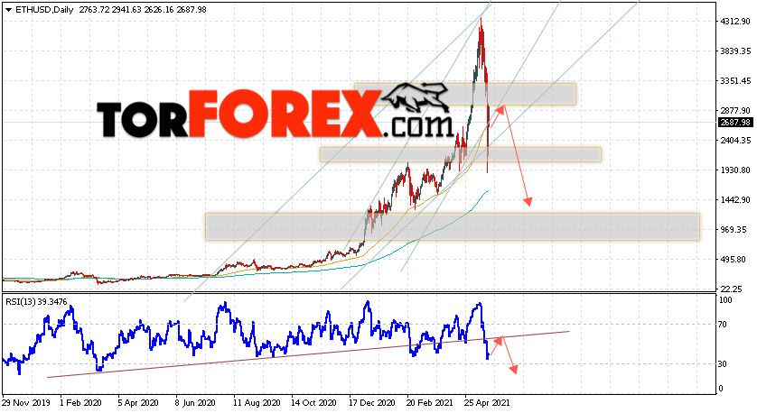 Дополнительным сигналом в пользу падения котировок ETH/USD на текущей торговой недели 24 — 28 мая 2021 выступит тест линии тренда на индикаторе относительной силы. Вторым сигналом станет отскок от нижней границы бычьего канала. Отменой варианта снижения стоимости криптовалюты на текущей торговой неделе станет сильный рост и пробой уровня 3405.05. Это укажет на пробой области сопротивления и продолжение подъёма котировок ETH/USD с потенциальной целью выше уровня 4505.05. Подтверждением падения криптовалюты Ethereum выступит пробой области поддержки и закрытие котировок ниже уровня 1885.05.
