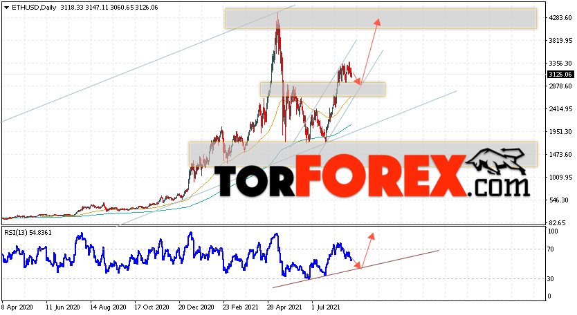 Дополнительным сигналом в пользу подъёма котировок ETH/USD на текущей торговой неделе 30 августа — 3 сентября 2021 выступит тест линии тренда на индикаторе относительной силы. Вторым сигналом станет отскок от нижней границы бычьего канала. Отменой варианта роста стоимости криптовалюты на текущей торговой неделе станет падение и пробой уровня 2425.05. Это укажет на пробой области поддержки и продолжение падения котировок ETH/USD с потенциальной целью ниже уровня 1755.05. Подтверждением подъёма криптовалюты Ethereum выступит пробой области сопротивления и закрытие котировок выше уровня 3545.05.