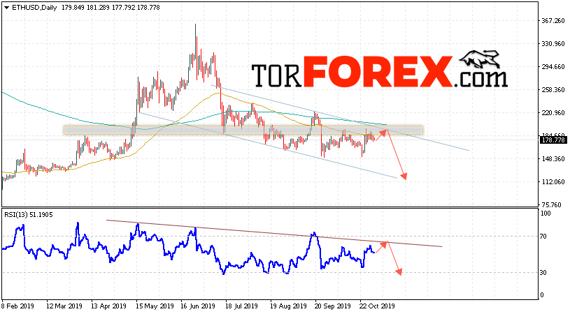 Дополнительным сигналом в пользу снижения котировок ETH/USD на текущей торговой недели 4 — 8 ноября 2019 выступит тест нисходящей линии сопротивления на индикаторе относительной силы. Вторым сигналом станет отскок от верхней границы нисходящего канала. Отменой варианта падения станет сильный рост и пробой уровня 215.50. Это укажет на пробой области сопротивления и продолжение роста ETH/USD с потенциальной целью выше уровня 245.00. Подтверждением падения криптовалюты Ethereum выступит пробой области поддержки и закрытие котировок ниже уровня 148.05.