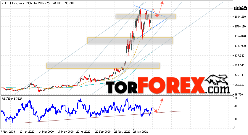 Дополнительным сигналом в пользу роста котировок ETH/USD на текущей торговой недели 5 — 9 апреля 2021 выступит тест линии тренда на индикаторе относительной силы. Вторым сигналом станет отскок от верхней границы модели ”Треугольник”. Отменой варианта роста стоимости криптовалюты на текущей торговой неделе станет падение и пробой уровня 1335.05. Это укажет на пробой области поддержки и продолжение падения котировок ETH/USD с потенциальной целью ниже уровня 805.05. Подтверждением роста криптовалюты Ethereum выступит пробой области сопротивления и закрытие котировок выше уровня 2255.05.