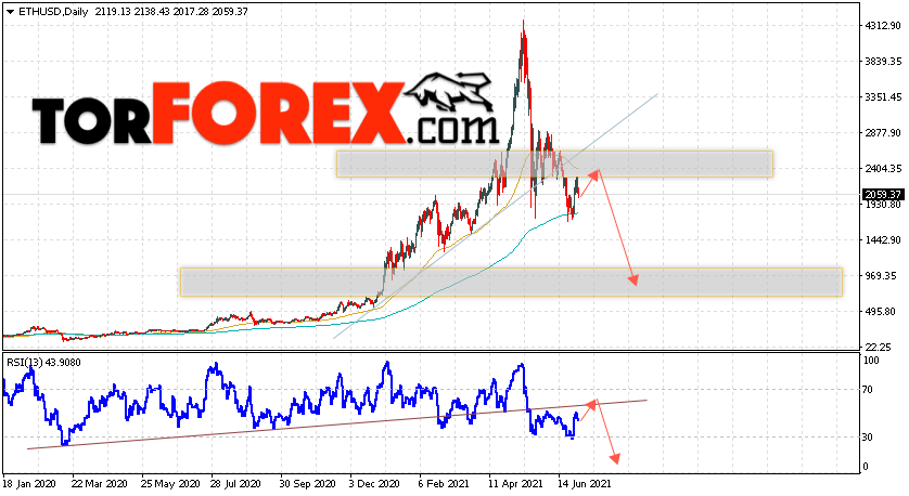 Дополнительным сигналом в пользу падения котировок ETH/USD на текущей торговой неделе 5 — 9 июля 2021 выступит тест линии тренда на индикаторе относительной силы. Вторым сигналом станет отскок от нижней границы бычьего канала. Отменой варианта снижения стоимости криптовалюты на текущей торговой неделе станет сильный рост и пробой уровня 2855.05. Это укажет на пробой области сопротивления и продолжение подъёма котировок ETH/USD с потенциальной целью выше уровня 4105.05. Подтверждением падения криптовалюты Ethereum выступит пробой области поддержки и закрытие котировок ниже уровня 1425.05.