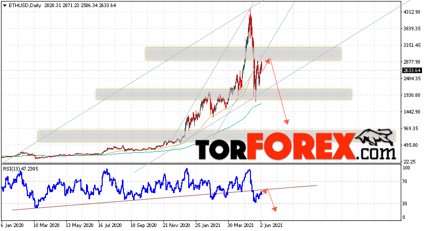 Дополнительным сигналом в пользу падения котировок ETH/USD на текущей торговой недели 7 — 11 июня 2021 выступит тест линии тренда на индикаторе относительной силы. Вторым сигналом станет отскок от нижней границы бычьего канала. Отменой варианта снижения стоимости криптовалюты на текущей торговой неделе станет сильный рост и пробой уровня 3405.05. Это укажет на пробой области сопротивления и продолжение подъёма котировок ETH/USD с потенциальной целью выше уровня 4455.05. Подтверждением падения криптовалюты Ethereum выступит пробой области поддержки и закрытие котировок ниже уровня 1605.05.