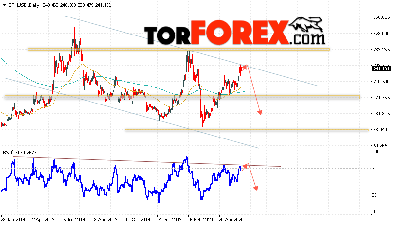 Дополнительным сигналом в пользу снижения котировок ETH/USD на текущей торговой недели 8 — 12 июня 2020 выступит тест линии сопротивления на индикаторе относительной силы. Вторым сигналом станет отскок от верхней границы нисходящего канала. Отменой варианта падения стоимости криптовалюты на текущей торговой неделе станет сильный рост и пробой уровня 265.05. Это укажет на пробой области сопротивления и продолжение роста котировок ETH/USD с потенциальной целью выше уровня 350.00. Подтверждением падения криптовалюты Ethereum выступит пробой области поддержки и закрытие котировок ниже уровня 165.55.