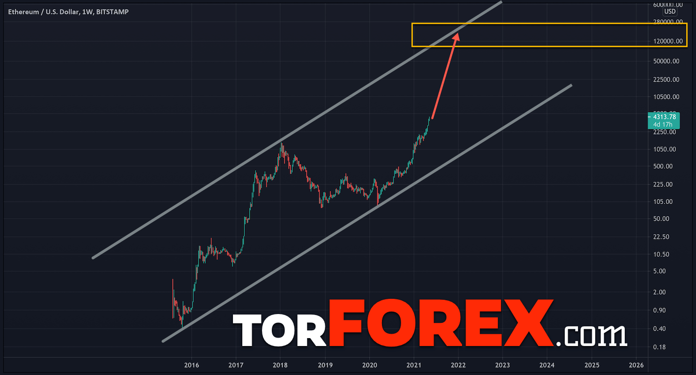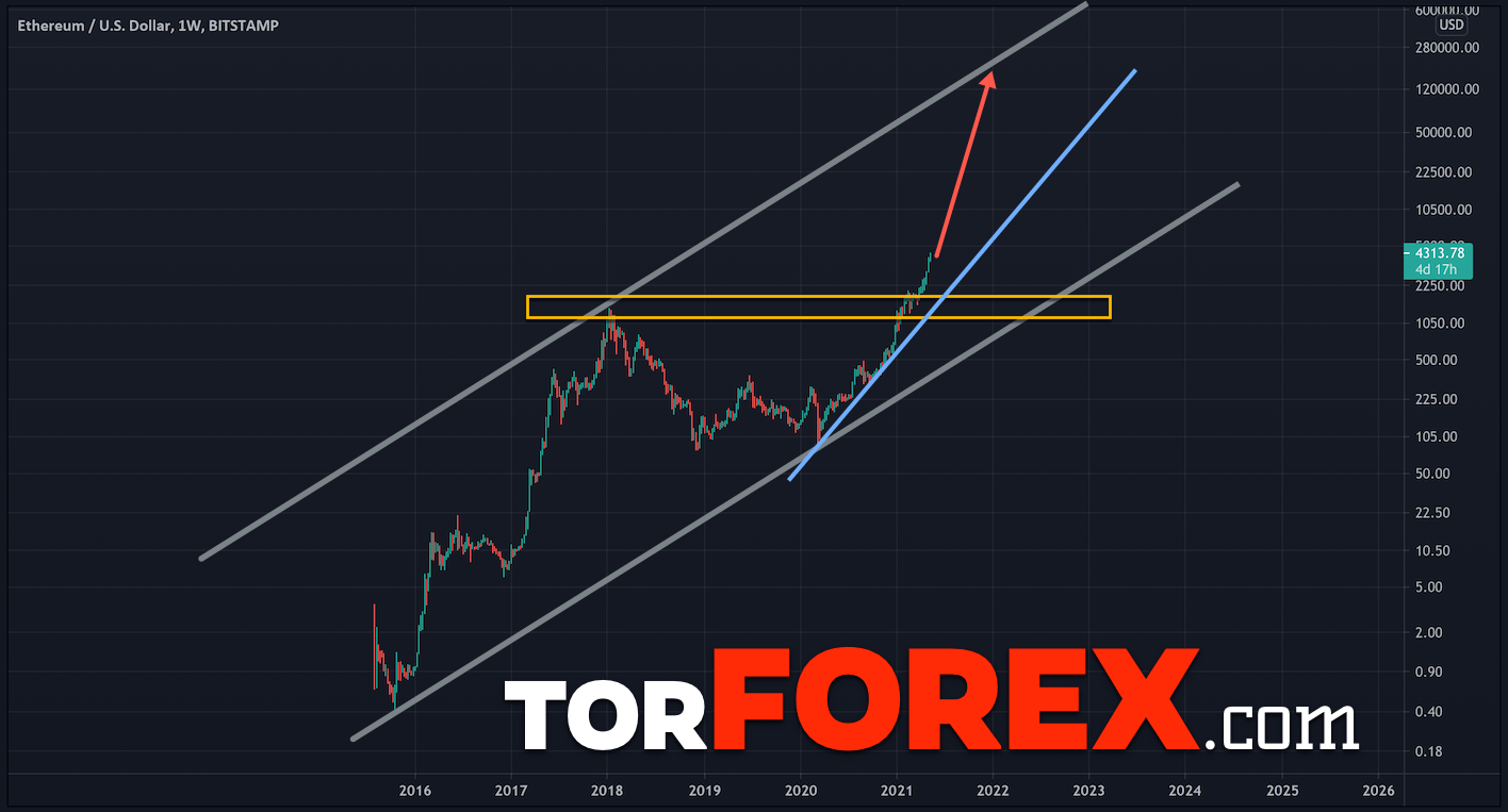 Всех интересует, какой же, будет курс криптовалюты Ethereum в 2021 и даже в 2022 году. Для такого анализа нужно брать большой график со всей историей монеты. В января 2021 курс пробил свой максимум и ушел выше. Если мы строим восходящий канала с начала появления монеты, то увидим, что верхняя граница располагается вблизи уровня $15000 — $16000 за актив.
