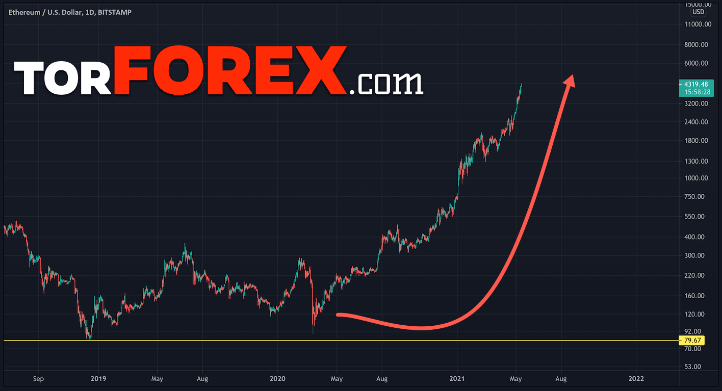 Весь крипторынок стремительно растет. Пришло ли время инвестировать? Какой Ethereum прогноз на 2021 год? А какой курс Ethereum будет в 2022 году? Когда человек с улицы хочет вложиться в крипту, как правило, он выбирает Bitcoin, но Ethereum показал невероятный рост. С начала года цена Ethereum взлетела боле, чем на 450%. За последние 12 месяцев стоимость монеты увеличилась более чем на 1700%. Для сравнения цена Bitcoin в этом году выросла примерно на 100%, а за последние 12 месяцев — на 518%.