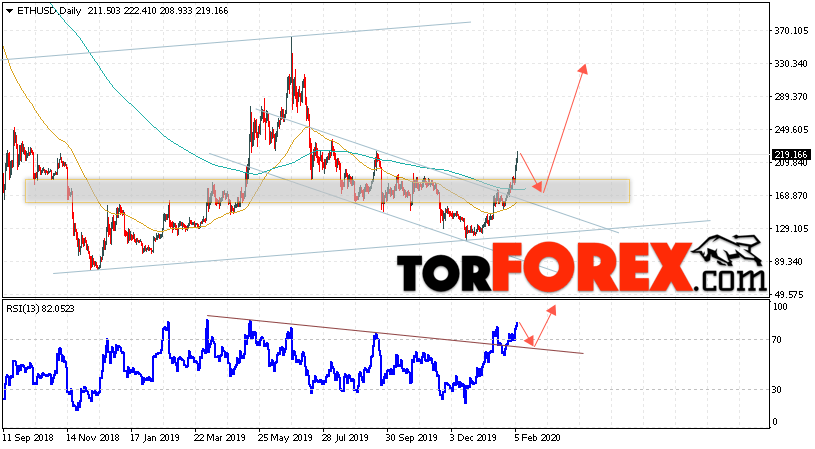 Дополнительным сигналом в пользу подъёма котировок ETH/USD на текущей торговой недели 10 — 14 февраля 2020 выступит тест линии поддержки на индикаторе относительной силы. Вторым сигналом станет отскок от верхней границы нисходящего канала. Отменой варианта роста станет падение и пробой уровня 115.05. Это укажет на пробой области поддержки и продолжение падения ETH/USD с потенциальной целью ниже уровня 75.05. Подтверждением роста криптовалюты Ethereum выступит пробой области сопротивления и закрытие котировок выше уровня 205.05.