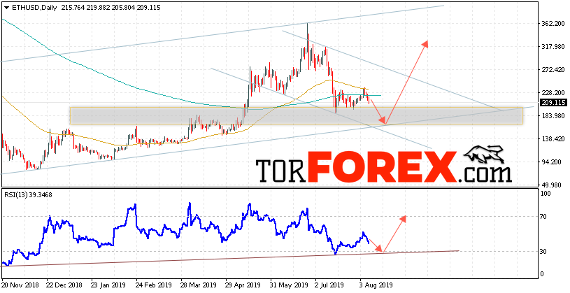 В пользу подъёма котировок ETH/USD на текущей торговой недели 12 — 16 августа 2019 выступит тест линии поддержки на индикаторе относительной силы. Вторым сигналом станет отскок от нижней границы восходящего канала. Отменой варианта роста станет падение и пробой уровня 135.00. Это укажет на пробой области поддержки и продолжение снижения ETH/USD с потенциальной целью ниже уровня 105.00. Подтверждением роста криптовалюты Ethereum выступит пробой верхней границы нисходящего канала и закрытие котировок выше уровня 275.00.