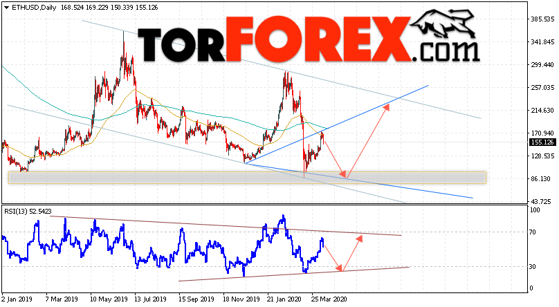 Дополнительным сигналом в пользу подъёма котировок ETH/USD на текущей торговой недели 13 — 17 апреля 2020 выступит тест линии поддержки на индикаторе относительной силы. Вторым сигналом станет отскок от нижней границы нисходящего канала. Отменой варианта роста станет падение и пробой уровня 50.05. Это укажет на пробой области поддержки и продолжение падения ETH/USD с потенциальной целью ниже уровня 25.05. Подтверждением роста криптовалюты Ethereum выступит пробой области сопротивления и закрытие котировок выше уровня 195.00.