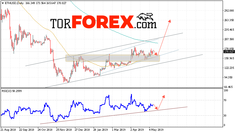 В пользу подъёма котировок ETH/USD на текущей торговой недели 13 — 17 мая 2019 выступит тест линии поддержки на индикаторе относительной силы. Вторым сигналом станет отскок от нижней границы восходящего канала. Отменой варианта роста станет падение и пробой уровня 135. Это укажет на пробой области поддержки и продолжение снижения ETH/USD с потенциальной целью ниже уровня 105. Подтверждением роста криптовалюты Ethereum выступит пробой области сопротивления и закрытие котировок выше уровня 185.