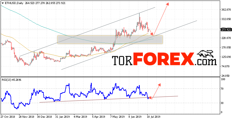 В пользу подъёма котировок ETH/USD на текущей торговой недели 15 — 19 июля 2019 выступит тест восходящей линии поддержки на индикаторе относительной силы. Вторым сигналом станет отскок от верхней нижней границы восходящего канала. Отменой варианта роста станет падение и пробой уровня 205.00. Это укажет на пробой области поддержки и продолжение снижения ETH/USD с потенциальной целью ниже уровня 165.00. Подтверждением роста криптовалюты Ethereum выступит пробой области сопротивления и закрытие котировок выше уровня 335.00.