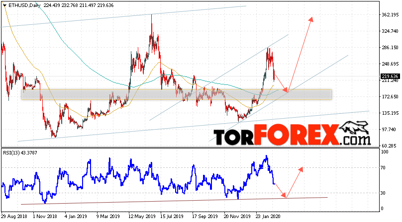 Дополнительным сигналом в пользу подъёма котировок ETH/USD на текущей торговой недели 2 — 6 марта 2020 выступит тест линии поддержки на индикаторе относительной силы. Вторым сигналом станет отскок от нижней границы восходящего канала. Отменой варианта роста станет падение и пробой уровня 165.05. Это укажет на пробой области поддержки и продолжение падения ETH/USD с потенциальной целью ниже уровня 105.05. Подтверждением роста криптовалюты Ethereum выступит пробой области сопротивления и закрытие котировок выше уровня 275.05.