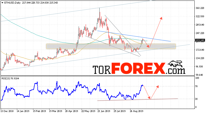 В пользу подъёма котировок ETH/USD на текущей торговой недели 23 — 27 сентября 2019 выступит тест линии поддержки на индикаторе относительной силы. Вторым сигналом станет отскок от нижней границы восходящего канала. Отменой варианта роста станет падение и пробой уровня 140.00. Это укажет на пробой области поддержки и продолжение снижения ETH/USD с потенциальной целью ниже уровня 95.00. Подтверждением роста криптовалюты Ethereum выступит пробой области сопротивления и закрытие котировок выше уровня 245.00.