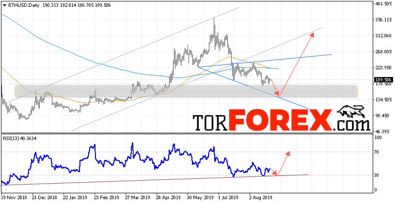 В пользу подъёма котировок ETH/USD на текущей торговой недели 26 — 30 августа 2019 выступит тест линии поддержки на индикаторе относительной силы. Вторым сигналом станет отскок от нижней границы восходящей модели «Волна Вульфа». Отменой варианта роста станет падение и пробой уровня 105.00. Это укажет на пробой области поддержки и продолжение снижения ETH/USD с потенциальной целью ниже уровня 80.00. Подтверждением роста криптовалюты Ethereum выступит пробой области сопротивления и закрытие котировок выше уровня 215.00.