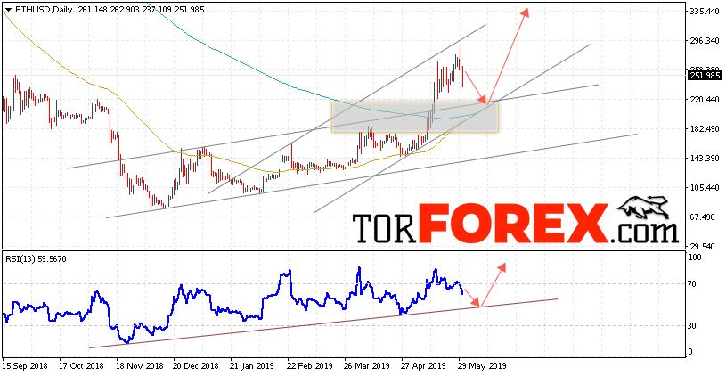 В пользу подъёма котировок ETH/USD на текущей торговой недели 3 — 7 июня 2019 выступит тест линии поддержки на индикаторе относительной силы. Вторым сигналом станет отскок от верхней границы восходящего канала. Отменой варианта роста станет падение и пробой уровня 185. Это укажет на пробой области поддержки и продолжение снижения ETH/USD с потенциальной целью ниже уровня 115. Подтверждением роста криптовалюты Ethereum выступит пробой области сопротивления и закрытие котировок выше уровня 310.