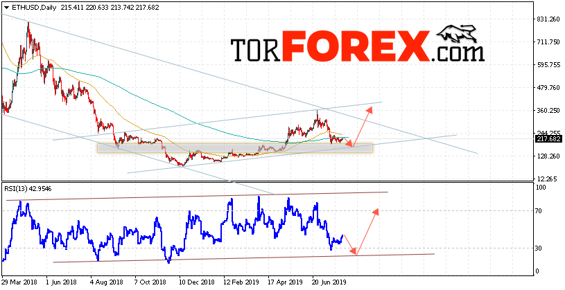 В пользу подъёма котировок ETH/USD на текущей торговой недели 5 — 9 августа 2019 выступит тест восходящей линии поддержки на индикаторе относительной силы. Вторым сигналом станет отскок от нижней границы восходящего канала. Отменой варианта роста станет падение и пробой уровня 170.00. Это укажет на пробой области поддержки и продолжение снижения ETH/USD с потенциальной целью ниже уровня 145.00. Подтверждением роста криптовалюты Ethereum выступит пробой области сопротивления и закрытие котировок выше уровня 255.00.
