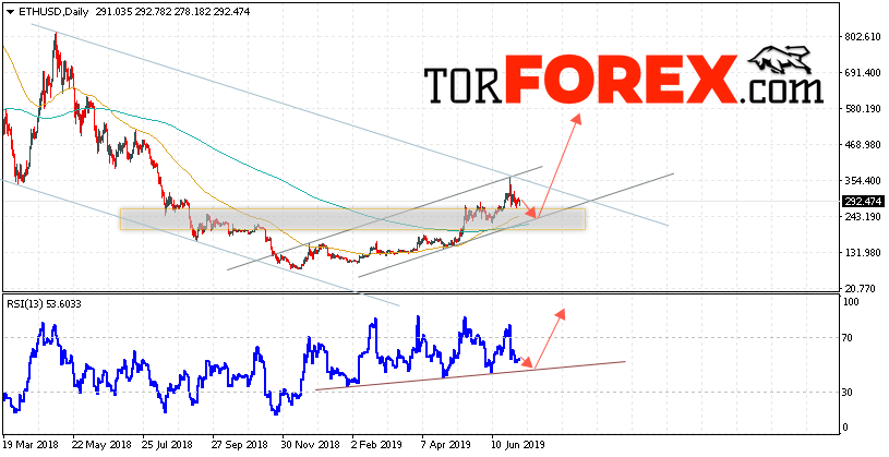 В пользу подъёма котировок ETH/USD на текущей торговой недели 8 — 12 июля 2019 выступит тест восходящей линии поддержки на индикаторе относительной силы. Вторым сигналом станет отскок от верхней нижней границы восходящего канала. Отменой варианта роста станет падение и пробой уровня 210.00. Это укажет на пробой области поддержки и продолжение снижения ETH/USD с потенциальной целью ниже уровня 155.00. Подтверждением роста криптовалюты Ethereum выступит пробой области сопротивления и закрытие котировок выше уровня 365.00.