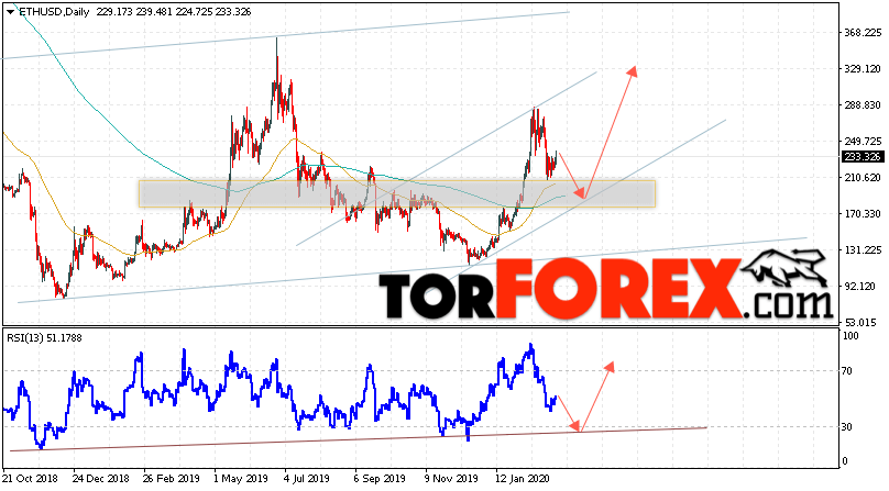 Дополнительным сигналом в пользу подъёма котировок ETH/USD на текущей торговой недели 9 — 13 марта 2020 выступит тест линии поддержки на индикаторе относительной силы. Вторым сигналом станет отскок от нижней границы восходящего канала. Отменой варианта роста станет падение и пробой уровня 165.05. Это укажет на пробой области поддержки и продолжение падения ETH/USD с потенциальной целью ниже уровня 105.05. Подтверждением роста криптовалюты Ethereum выступит пробой области сопротивления и закрытие котировок выше уровня 265.05.