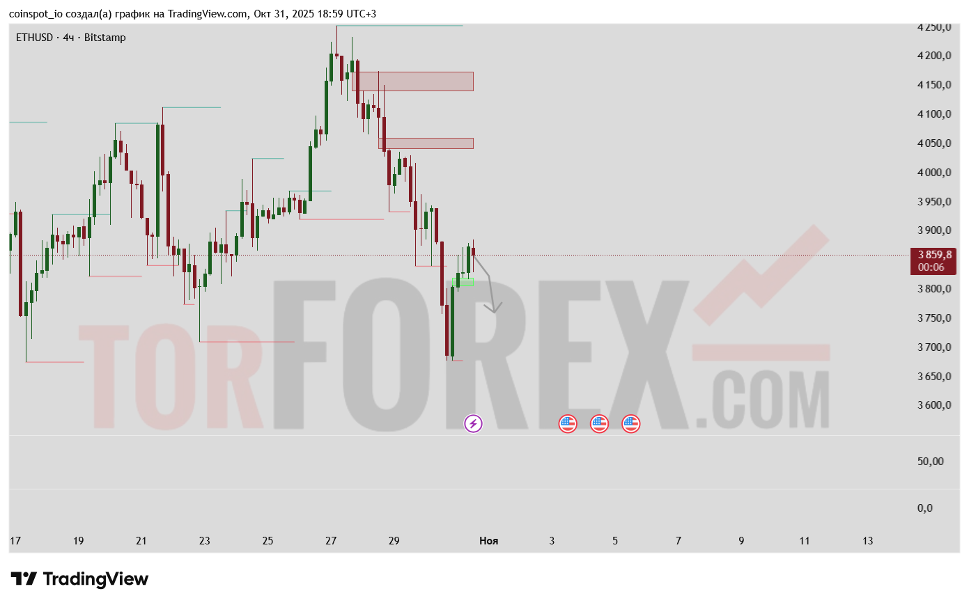 На 1 ноября 2025 года ETH/USD демонстрирует признаки восстановления после локального снижения. Основная торговая идея — удержание длинных позиций при закреплении выше 3,850 с целями в районе 3,920–3,960. Альтернативный сценарий — при пробое 3,820 вниз рассматривать возврат к зоне поддержки 3,760, где возможен повторный отскок.
