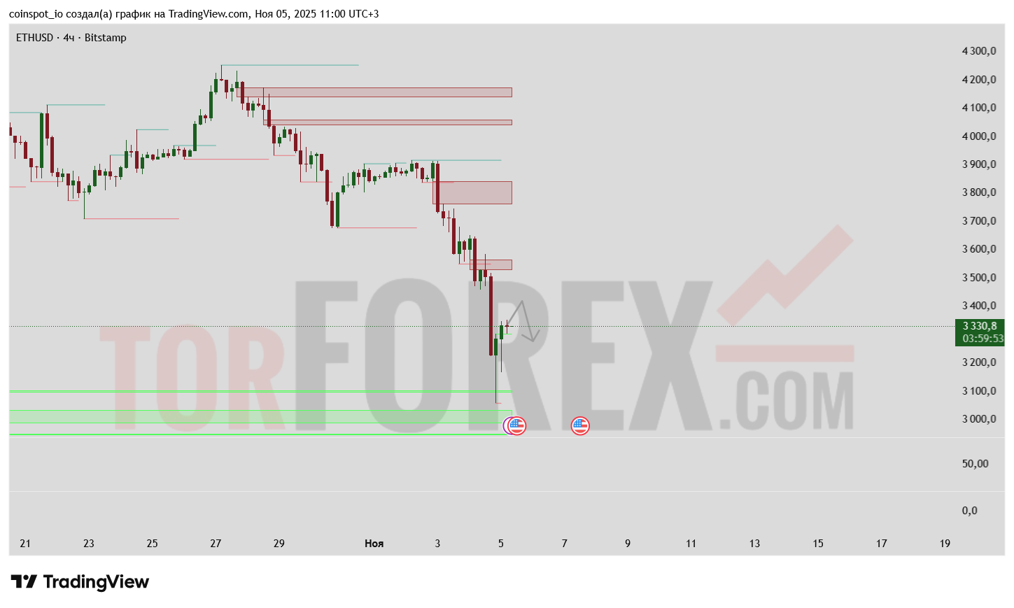 - В этом случае структура переломится, и ETH сможет протестировать уровни 3 480–3 500.