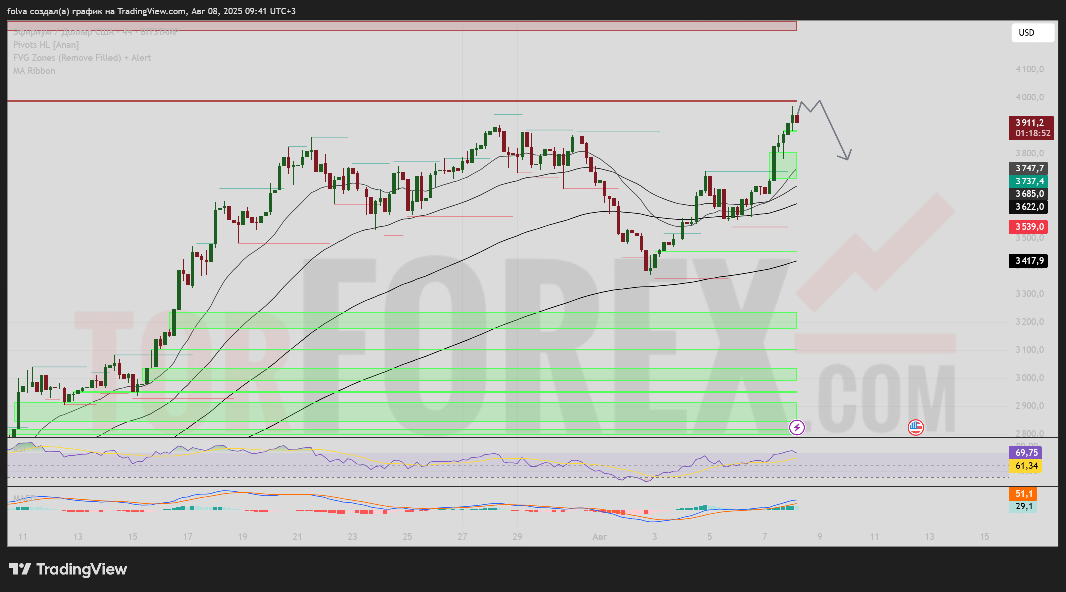 Отскок от 3 990–4 000 долларов и пробой 3 750 долларов станет первым сигналом к коррекции в зону 3 685–3 620 долларов. Более глубокое снижение возможно к 3 560–3 540 долларов, где проходит EMA 200 и нижняя граница крупной FVG-зоны.