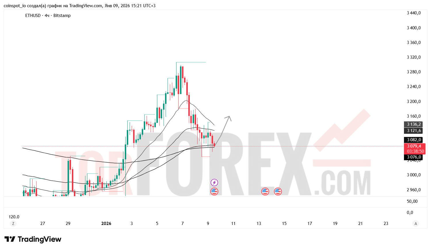На 10 января 2026 года ETH/USD сохраняет нейтрально-медвежью структуру с признаками углубления коррекции. Основной сценарий — восстановление к 3 150–3 200 USD при пробое зоны сопротивления. Альтернативный сценарий — откат к 3 030–2 990 USD при отказе от уровня 3 085.90 USD.
