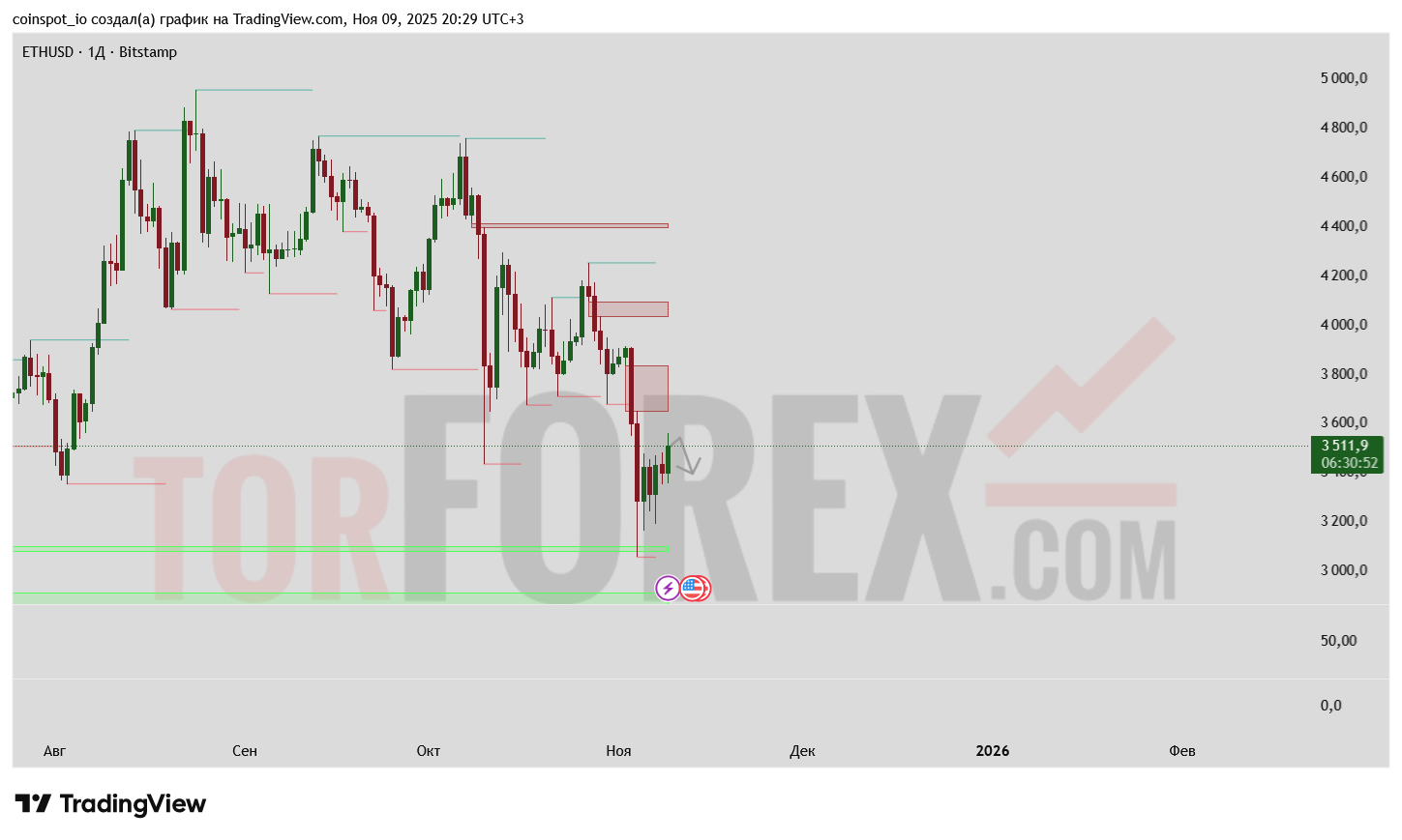 На неделю 10–17 ноября 2025 года торговая пара ETH/USD сохраняет признаки слабости после локального роста, и основной сценарий предполагает коррекцию от уровня 3550–3600 USD. Предпочтение отдается коротким позициям при подтверждении слабости на ретесте сопротивления, с диапазоном входа 3540–3560 USD, целями на уровнях 3450 и 3400 USD и стоп-лоссом выше 3700 USD. Альтернативный сценарий роста к 3800–3850 USD возможен только при пробое EMA 200, однако его вероятность ограничена без фундаментального драйвера.