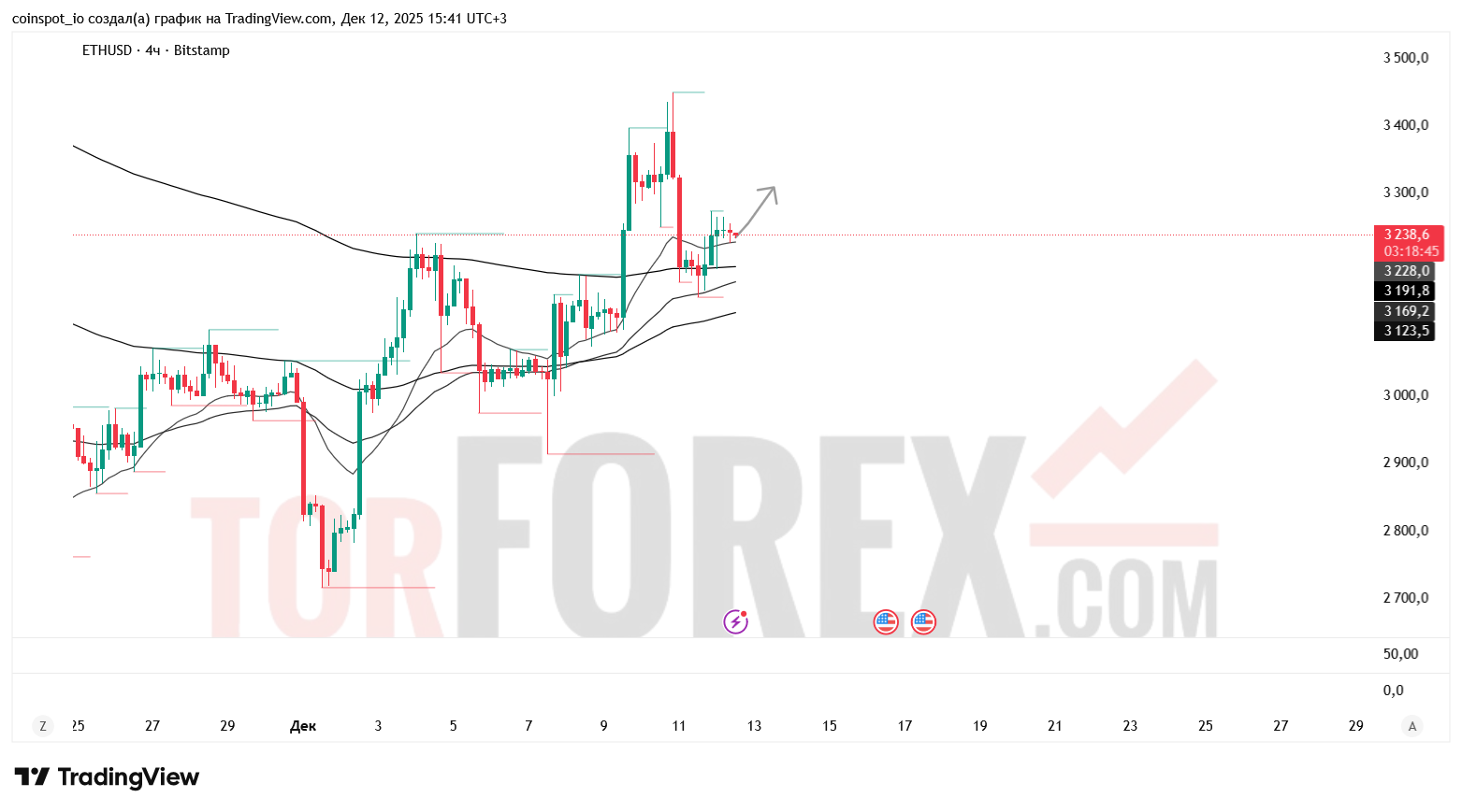 На 13 декабря 2025 года ETH/USD демонстрирует признаки консолидации. Основной сценарий — рост к 3 280–3 310 USD при пробое сопротивления. Альтернативный сценарий — снижение к 3 160–3 130 USD при отказе от уровня 3 250 USD.