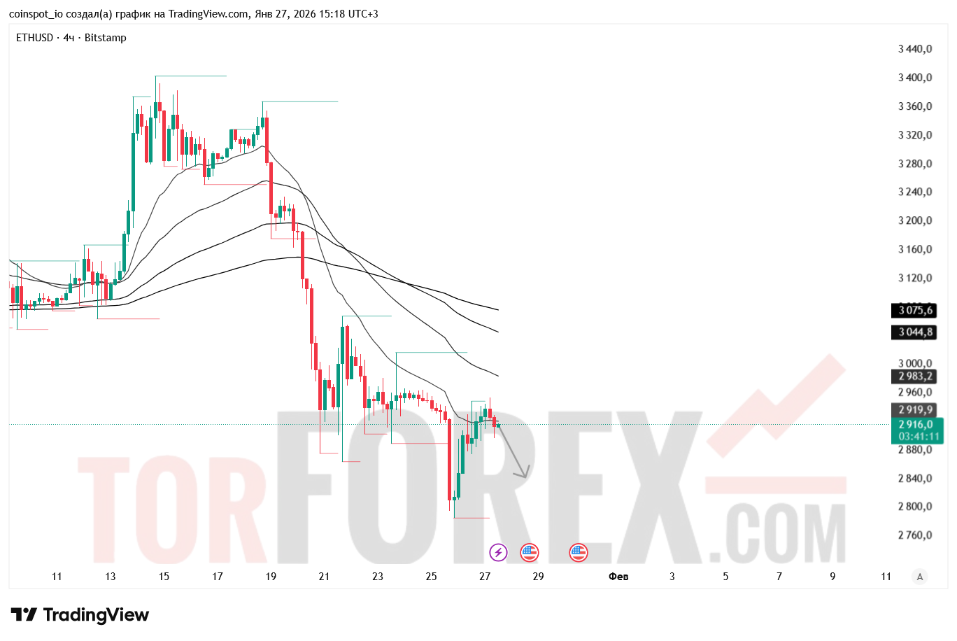 На 28 января 2026 года ETH/USD сохраняет нейтрально-медвежью структуру с признаками консолидации. Основной сценарий — снижение к 2 860–2 840 USD при пробое поддержки. Альтернативный сценарий — рост к 2 980–3 000 USD при пробое зоны сопротивления.
