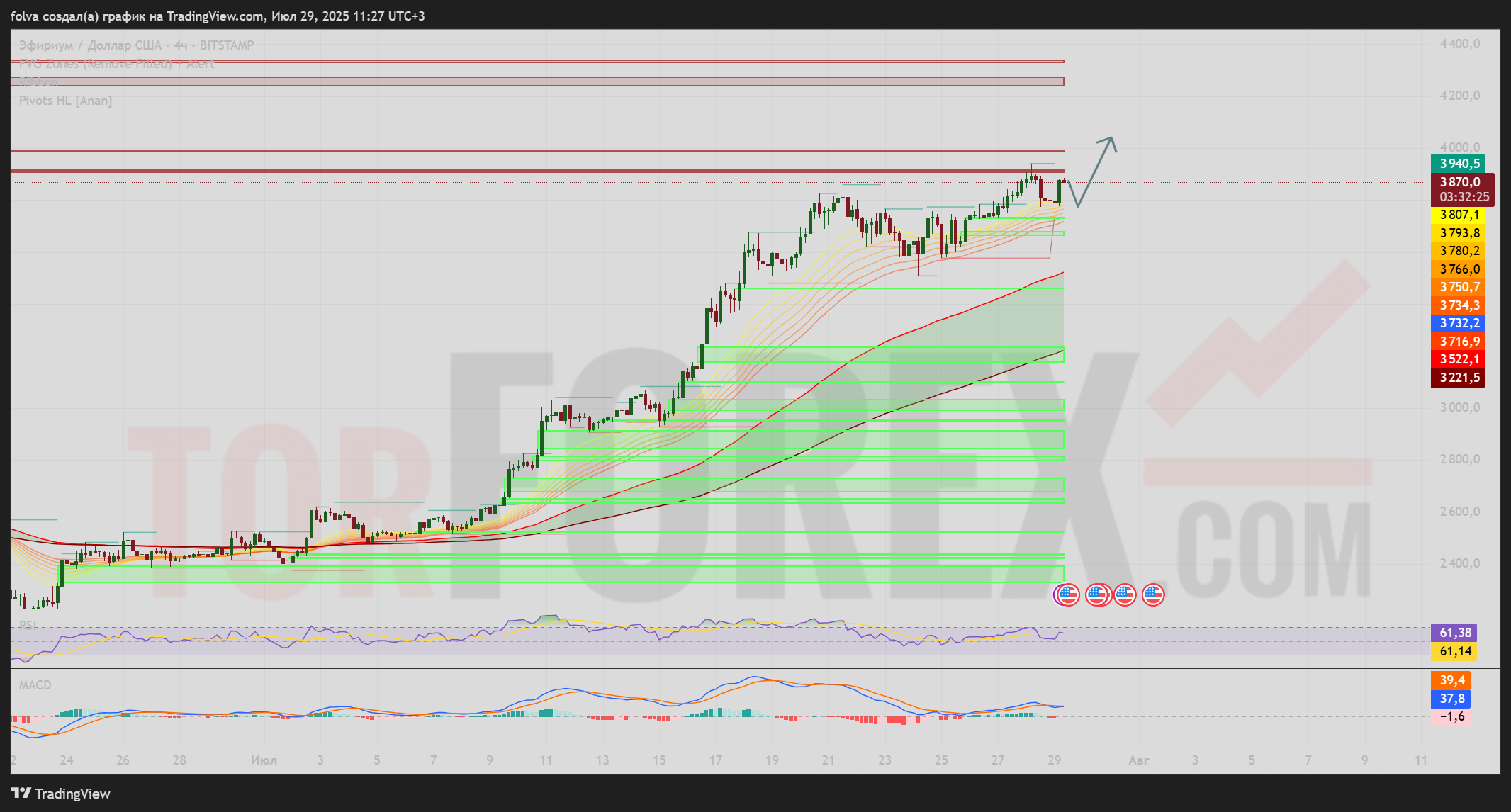 Эфириум завершает июль на сильной бычьей ноте, обновляя локальные максимумы и демонстрируя устойчивую восходящую структуру. Цена подошла вплотную к ключевому сопротивлению на $3940, где ранее фиксировалась активность продавцов. Технические индикаторы подтверждают сохранение бычьей фазы, однако в краткосрочной перспективе вероятна реакция на зону предложения.