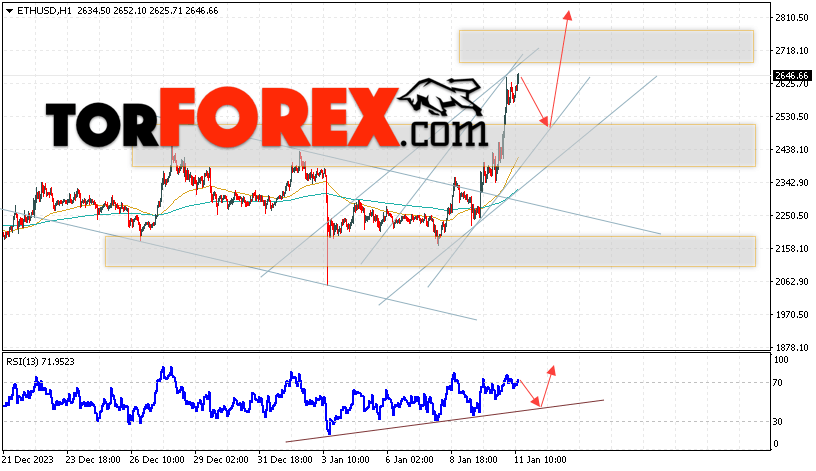 Таким образом, ETH/USD прогноз Ethereum на 12 января 2024 предполагает попытку коррекции и тест области поддержки вблизи уровня 2515. Откуда стоит ожидать отскок и продолжения роста криптовалюты ETH/USD в область выше уровня 2865. Дополнительным сигналом в пользу подъёма Ethereum выступит тест линии тренда на индикаторе относительной силы. Отменой варианта роста цифровой валюты станет пробой области 2345. Что укажет на продолжение падения цифровой валюты с потенциальной целью ниже уровня 2015.