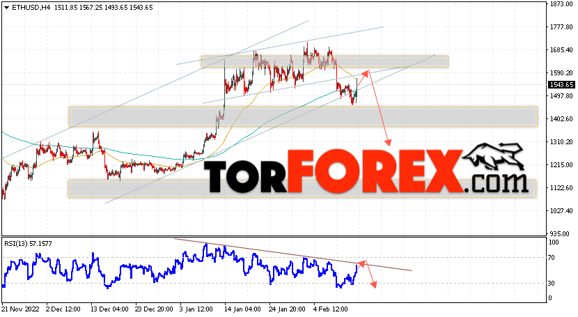Дополнительным сигналом в пользу снижения котировок ETH/USD выступит тест линии сопротивления на индикаторе относительной силы. Вторым сигналом выступит отбой от нижней границы бычьего канала, который был пробит продавцами вниз. Отменой варианта падения криптовалюты станет сильный рост Эфириума и пробой уровня 1695. Это укажет на пробой области сопротивления и продолжение роста котировок ETH/USD выше уровня 1895. С пробоем области поддержки и закрытием котировок ниже уровня 1395.