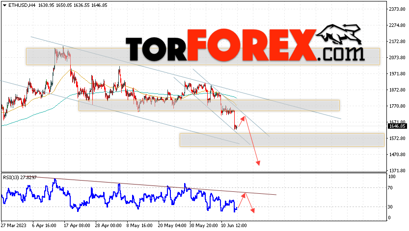 Дополнительным сигналом в пользу падения котировок ETH/USD выступит тест линии сопротивления на индикаторе относительной силы. Вторым сигналом выступит отбой от верхней границы медвежьего канала. Отменой варианта падения криптовалюты станет сильный рост стоимости Эфириума и пробой уровня 1785. Это укажет на пробой области сопротивления и продолжение роста котировок ETH/USD выше уровня 1985. С пробоем области поддержки и закрытием котировок ниже уровня 1565.
