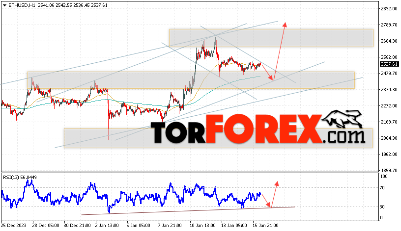 Таким образом, ETH/USD прогноз Ethereum на 17 января 2024 предполагает попытку коррекции и тест области поддержки вблизи уровня 2465. Откуда стоит ожидать отскок и продолжения роста криптовалюты ETH/USD в область выше уровня 2785. Дополнительным сигналом в пользу подъёма Ethereum выступит тест линии тренда на индикаторе относительной силы. Отменой варианта роста цифровой валюты станет пробой области 2365. Что укажет на продолжение падения цифровой валюты с потенциальной целью ниже уровня 2085.