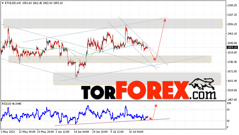Таким образом, ETH/USD прогноз Ethereum на 27 июля 2023 предполагает попытку коррекции и тест области поддержки вблизи уровня 1760. Откуда стоит ожидать отскок и продолжения роста криптовалюты ETH/USD в область выше уровня 2065. Дополнительным сигналом в пользу подъёма Ethereum выступит тест линии тренда на индикаторе относительной силы. Отменой варианта роста цифровой валюты станет пробой области 1675. Что укажет на продолжение снижения цифровой валюты с потенциальной целью ниже уровня 1535.