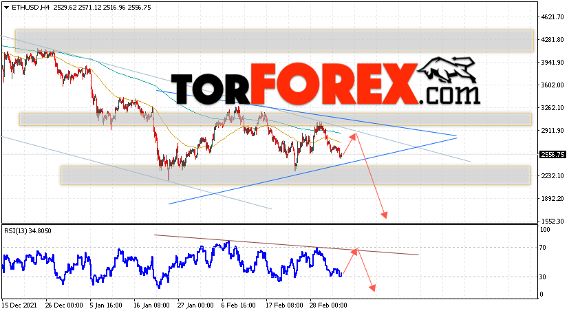 Дополнительным сигналом в пользу падения котировок ETH/USD выступит тест линии сопротивления на индикаторе относительной силы (RSI). Вторым сигналом станет отскок от верхней границы модели ”Треугольник». Отменой варианта падения криптовалюты станет сильный рост и пробой уровня 3355. Это укажет на пробой области сопротивления и продолжение роста котировок ETH/USD выше уровня 3825. С пробоем области поддержки и закрытием котировок ниже уровня 2105 стоит ожидать подтверждения развития нисходящего движения по Ethereum и начало отработки модели ”Треугольник”.
