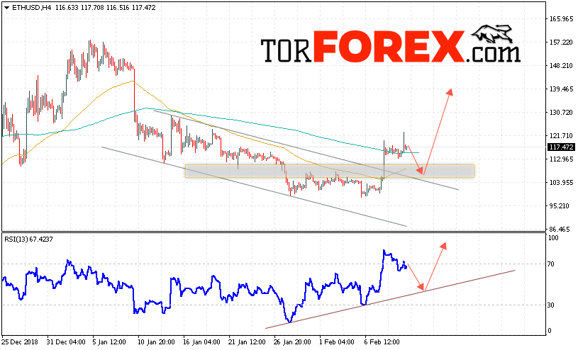 Дополнительным сигналом в пользу роста котировок ETH/USD выступит тест восходящей линии тренда на индикаторе относительной силы. А также отскок от верхней границы нисходящего канала. Отменой варианта подъёма криптовалюты станет падение и пробой уровня 95. Это укажет на пробой поддержки и продолжение падения котировок ETH/USD ниже уровня 80. С пробоем области сопротивления и закрытием котировок выше уровня 125 стоит ожидать ускорения развития восходящего движения по Ethereum.