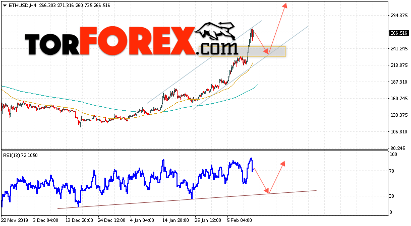 Дополнительным сигналом в пользу подъёма котировок ETH/USD выступит тест линии поддержки на индикаторе относительной силы (RSI). Вторым сигналом станет отскок от нижней границы восходящего канала. Отменой варианта роста криптовалюты станет падение и пробой уровня 210.05. Это укажет на пробой нижнем границы восходящего канала и продолжение падения котировок ETH/USD ниже уровня 175.05. С пробоем области сопротивления и закрытием котировок выше уровня 285.05 стоит ожидать подтверждения развития роста по Ethereum.