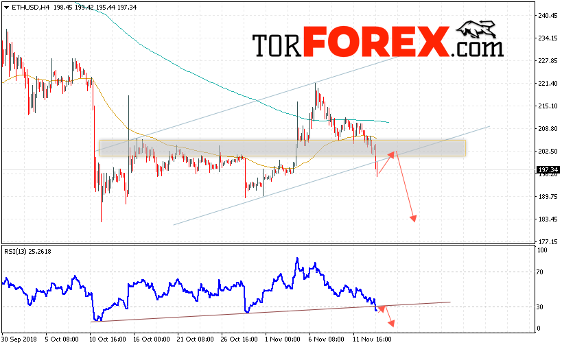 Таким образом, ETH/USD прогноз курса Ethereum на 15 ноября 2018 предполагает попытку теста области сопротивления вблизи уровня 200. Откуда стоит ожидать отскок и продолжения падения криптовалюты ETH/USD в область ниже уровня 180. Дополнительным сигналом в пользу снижения Ethereum выступит тест линии тренда на индикаторе относительной силы. Отменой варианта падения цифровой валюты выступит пробой области 210. Такой вариант укажет на продолжение роста с потенциальной целью выше уровня 230.